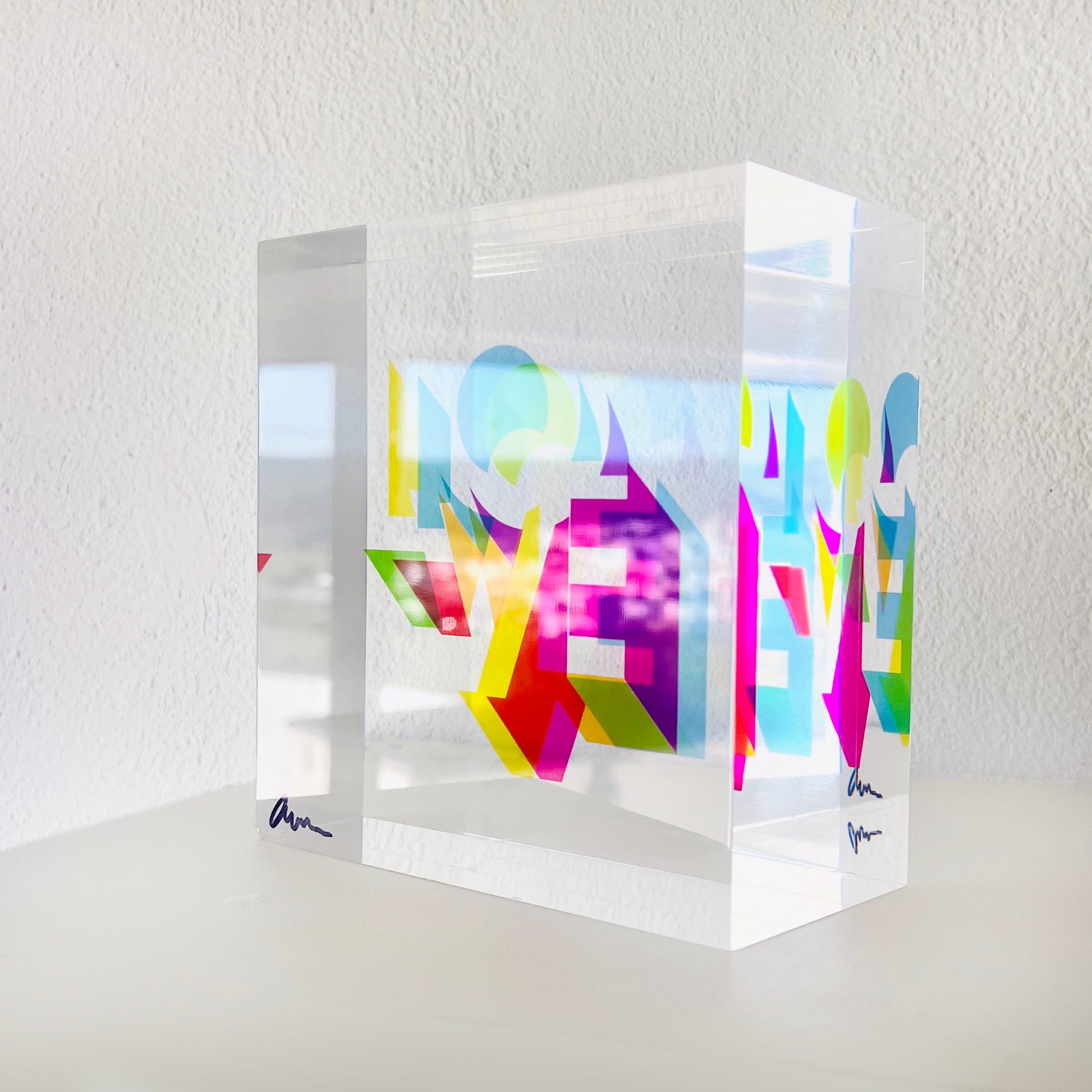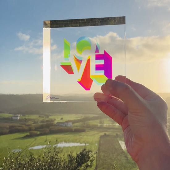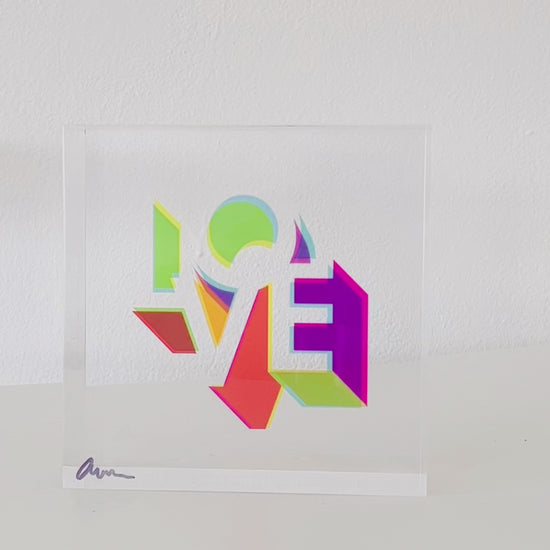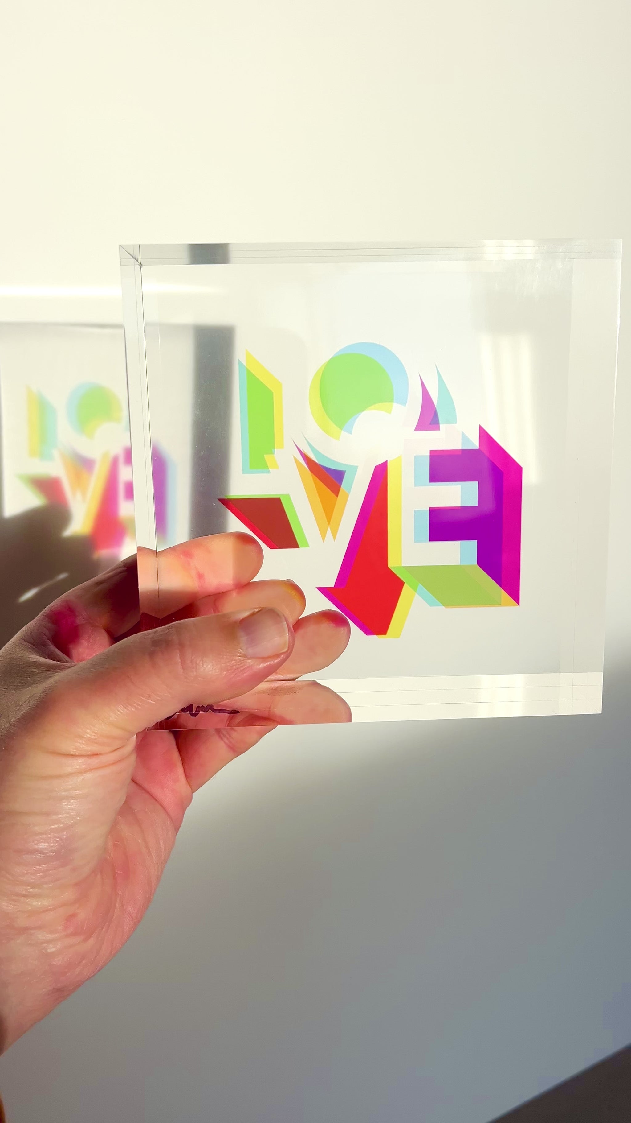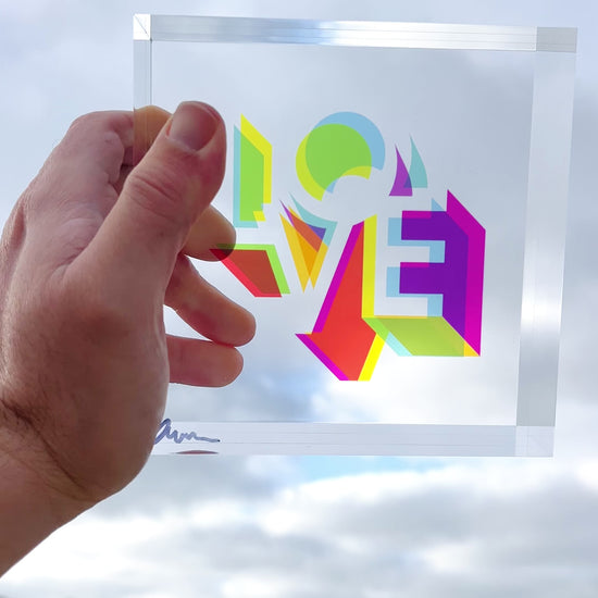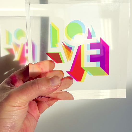I wanted to bring overprinting into sculpture. In screen printing, it’s the moment when layered inks overlap and create new colours. With translucent acrylic, light does the mixing. That’s how these Love blocks came to life.